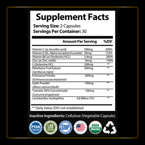 vitamin c vitamin e vitamin b6 zinc l-glutamine elderberry fruit extract echinacea powder garlic powder turmeric lactobacillus acidophilus